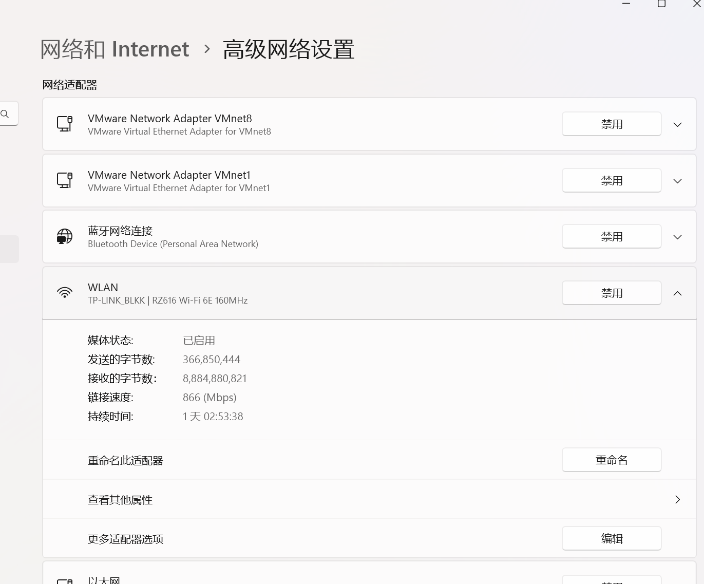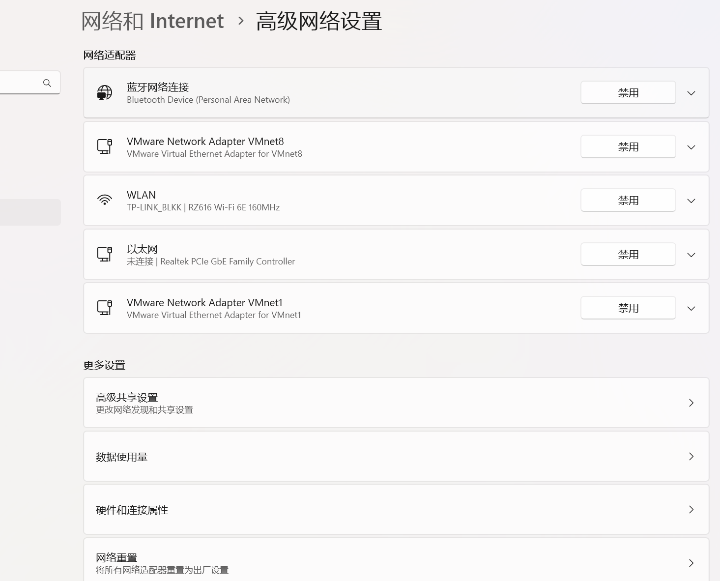 在本地设置里面网络和Internet高级网络设置 更多网络适配器,确保VMware正常启用。