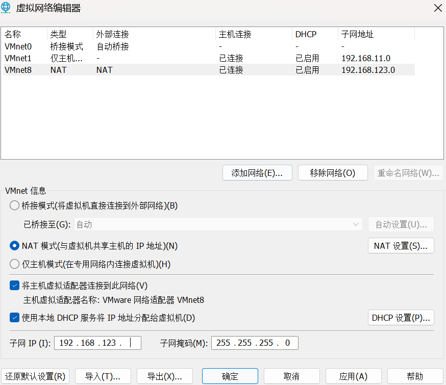 | VMnet8(NAT) | 虚拟机通过主机网络中继上网 | 独立虚拟网段(例如192.168.1.0),不与主机物理网段重叠;若重叠会导致DHCP冲突 | 建议不同(与主机物理网段重叠可能引发冲突,除非手动配置且明确后果) |