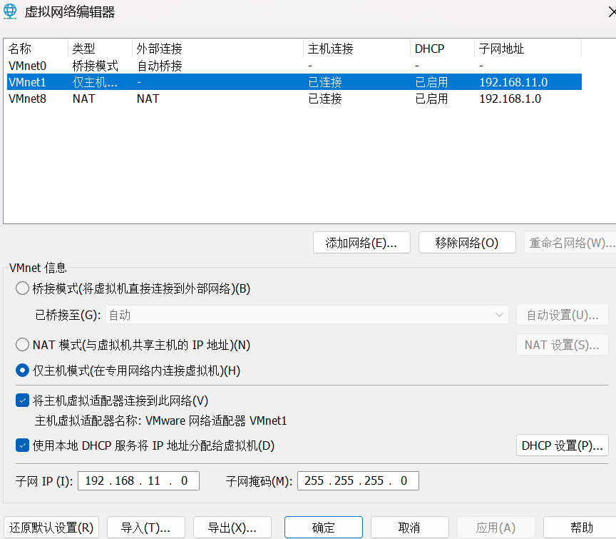 | VMnet1(仅主机) | 虚拟机仅与主机通信,无法连接外网 | 独立虚拟网段(例如192.168.11.0),不与主机物理网段或其他虚拟网段重叠即可 | 可以不同(仅主机模式与物理网络隔离,无需外网连接) |