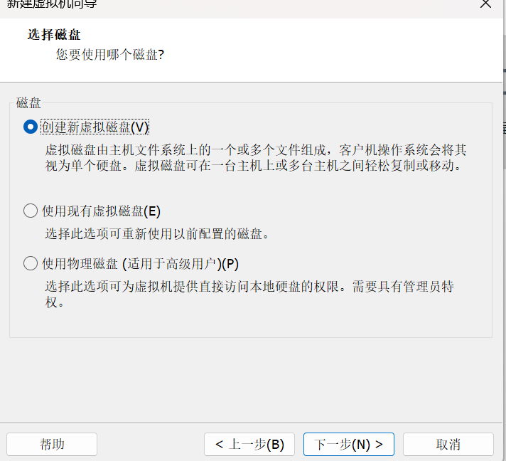 使用物理磁盘(适用于高级用户)(P):让虚拟机直接访问主机的物理硬盘分区 / 磁盘,风险较高!操作不当可能损坏主机数据(比如虚拟机格式化、分区误操作,会影响主机真实硬盘 ),而且配置复杂(得手动选物理磁盘、分区,还要处理权限等问题 ),新手别碰,除非你是高级用户,有特殊需求(比如虚拟机要直接读写主机物理硬盘里的特定数据 )。