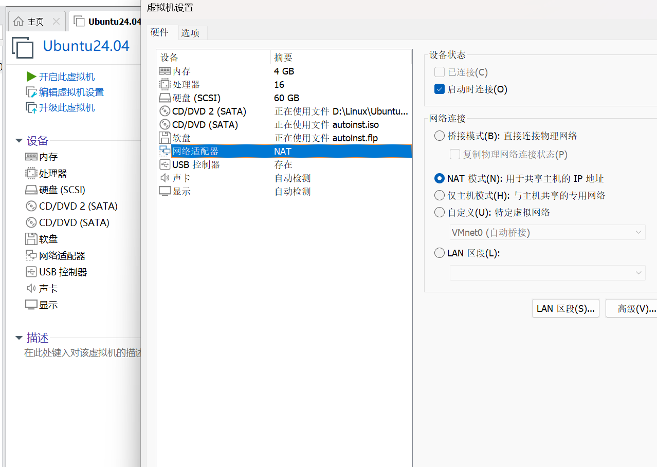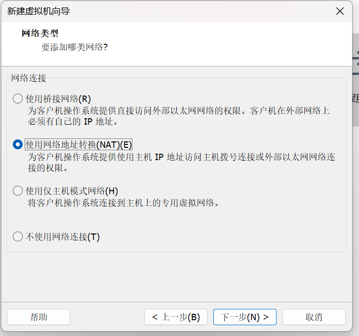 使用网络地址转换(NAT)(E):虚拟机借主机网络 “中转” 上网,共享主机的 IP 。无需手动配网络,装完系统一般就能直接连外网(走主机的 WiFi ),且外网设备没法直接访问虚拟机(保障一定安全性 )。日常大多数场景(像虚拟机装系统、跑程序、浏览网页等常规上网需求 )选它最省心,是默认且推荐的选项,你笔记本连 WiFi 时,选 NAT 模式基本能满足 “虚拟机上网” 需求,不用额外折腾网络配置。