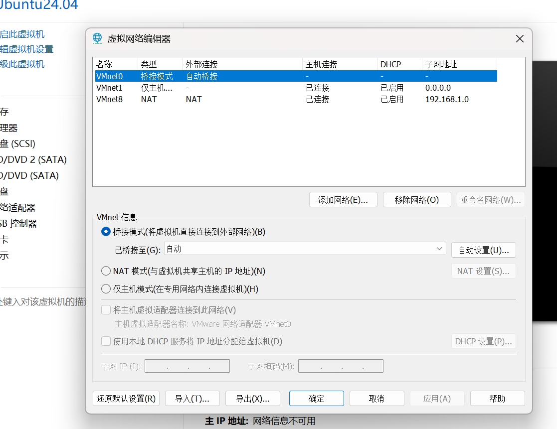 | VMnet0(桥接) | 虚拟机直接连接物理网络 | 必须和主机物理网络网段相同(例如主机是192.168.1.100,虚拟机需为192.168.1.x) | 必须相同(否则桥接后无法联网,因为需要接入物理网络) |