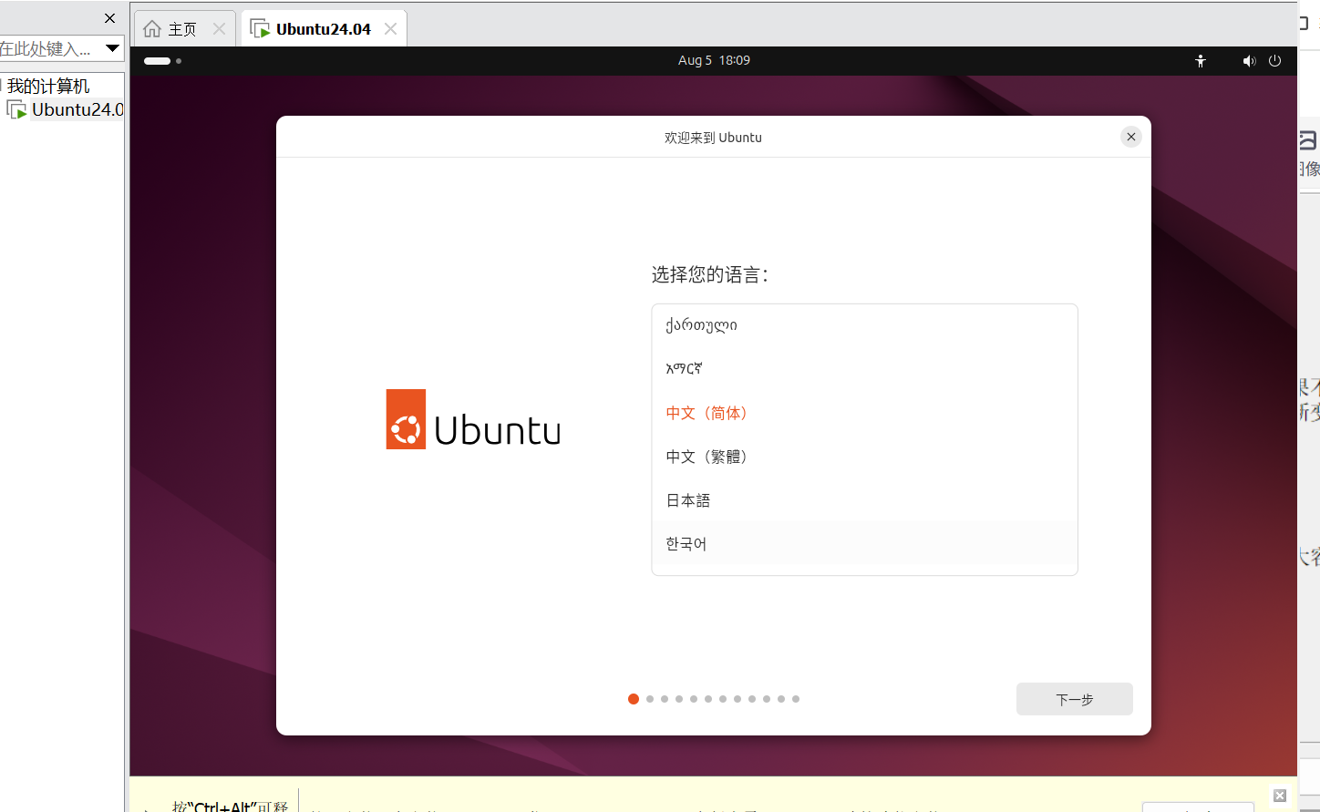 进入Ubuntu后,语言选择可以选择中文,往下翻有中文