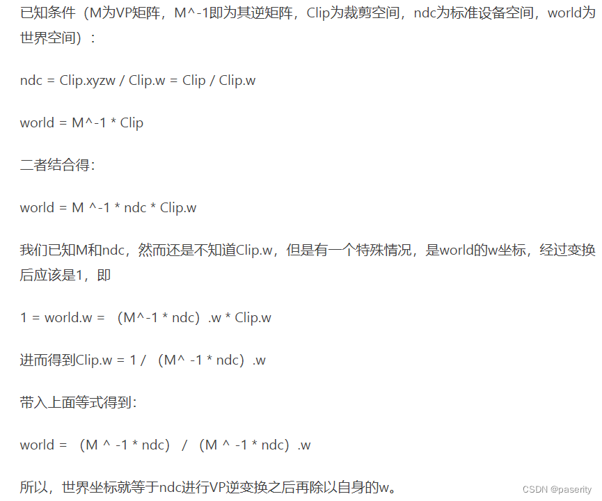 然后就是应用逆矩阵,推导过程摘抄一下Unity Shader 深度值重建世界坐标 - 简书推导流程,给出公式如下: