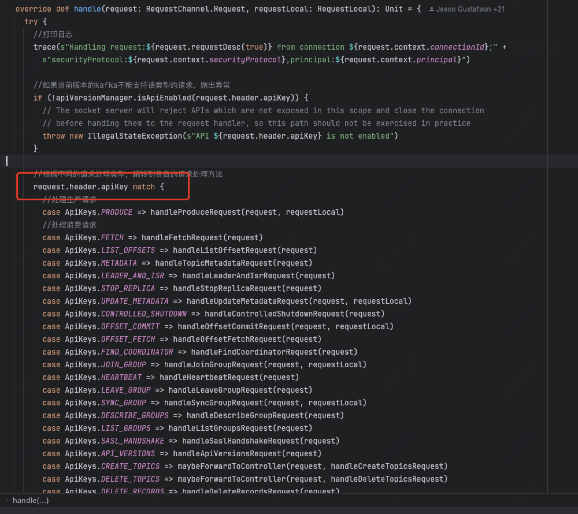 handler(KafkaRequestHandler)是真正处理各类请求的对象,KafkaRequestHandler本质是一个Runnable实例,其run方法是不断(while)在请求队列(由processor放请求)中获取请求并处理(具体是使用他的KafkaApis),他的业务处理代码比较朴实无华,通过Switch case判断请求类型并做处理