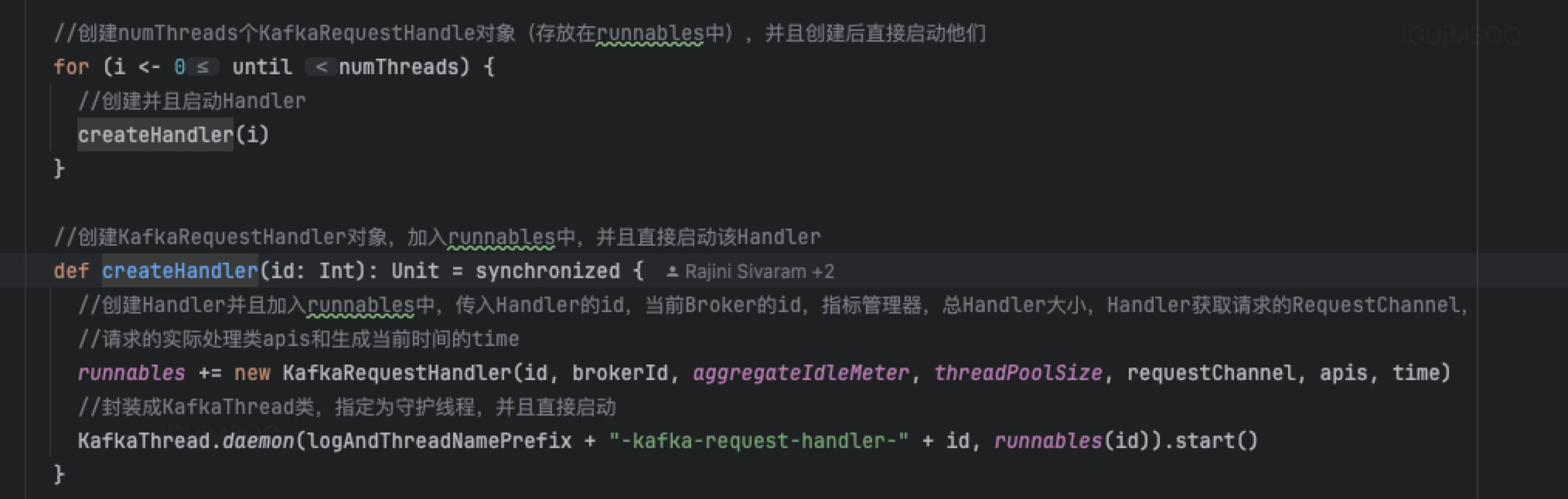 KafkaRequestHandlerPool中会使用KafkaRequestHandler创建并启动若干个(可以通过num.io.threads指定)新的线程,每个Handler都会抢占式地源源不断地在processor的RequestChannel成员requestChannel中获取请求处理,(各个processor用的是同一个requestChannel),