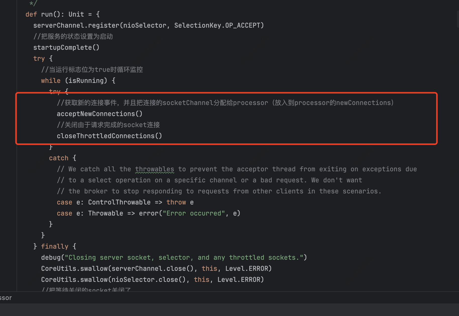 他的run方法会把serverChannel的ACCEPT事件注册到自己的nioSelector中并设置一些启动标志位,然后再在while循环中轮询地获取连接事件并且移交给Processor,同时也会关闭由于请求完成的socket连接。