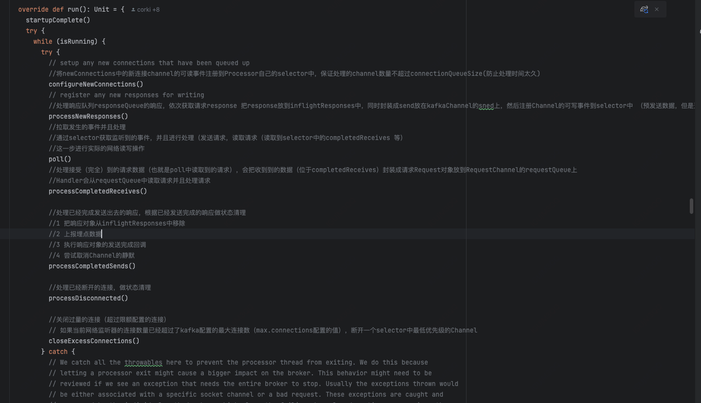 broker内部可以有多个processor(可以通过num.network.threads数来调整),可以提高并发量,processor有一个内部的KSelector(kafka在nio的selector上封装的一个selector),把acceptor给过来的新连接channel的可读事件注册到Processor自己的selector中,通过监听事件来进行流转和处理,他也是在run方法中循环地进行请求流转,具体包括下面7个工作内容。