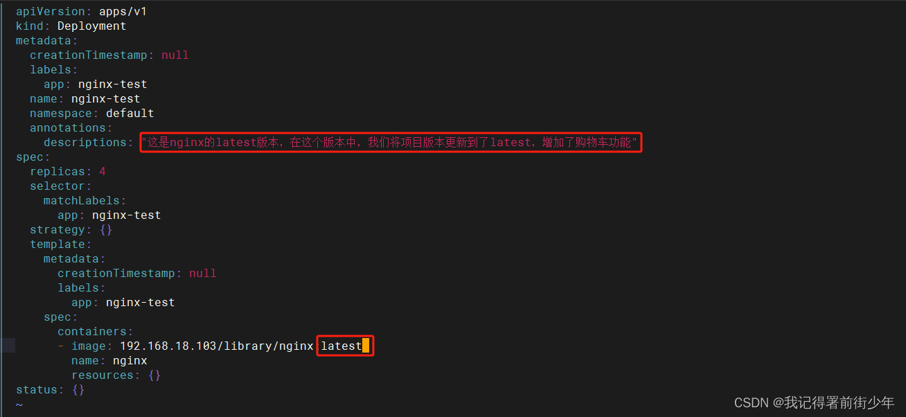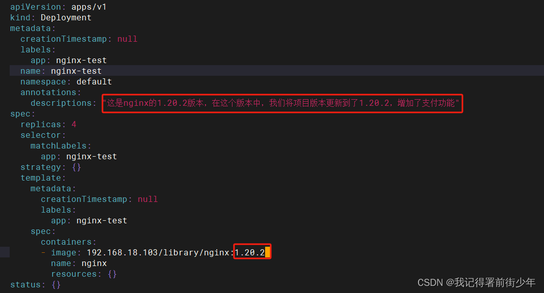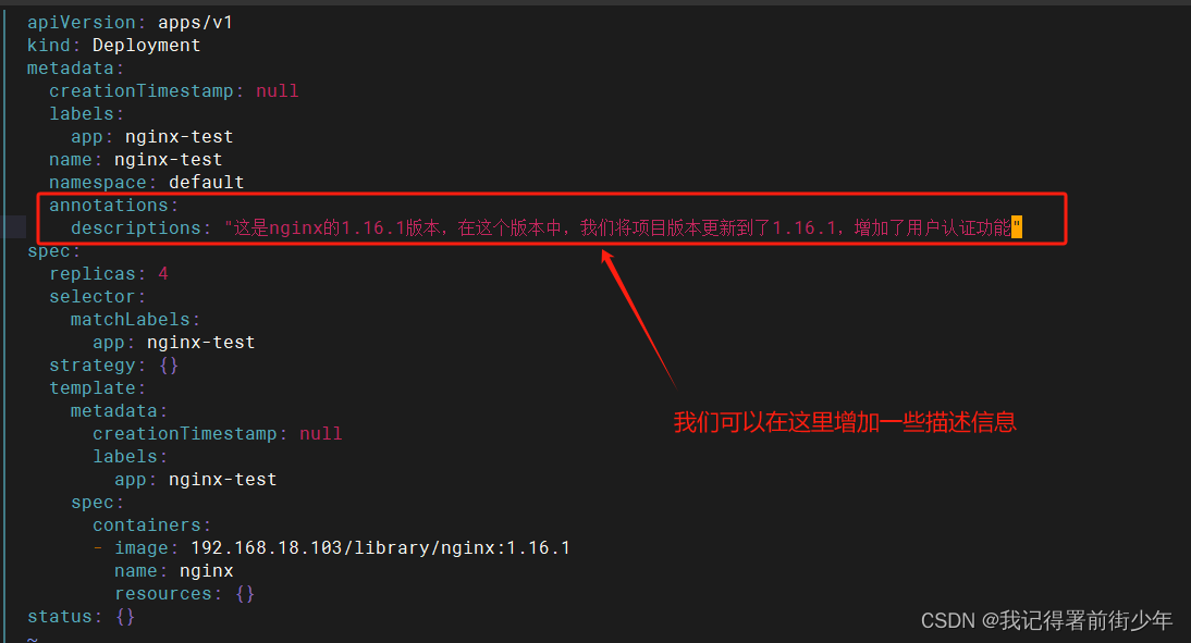 [root@kube-master ~]# kubectl create deployment nginx-test --image=192.168.18.103/library/nginx:1.16.1 --namespace=default --dry-run -o yaml > nginx-test.yml