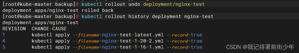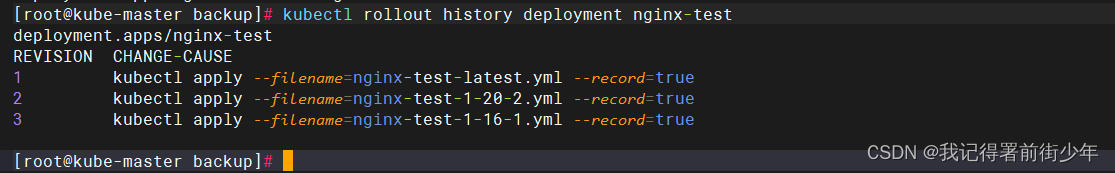 由于在创建这个 Deployment 的时候,指定了--record 参数,会将创建这些版本时执行的 kubectl 时文件中的配置,都会记录下来。
