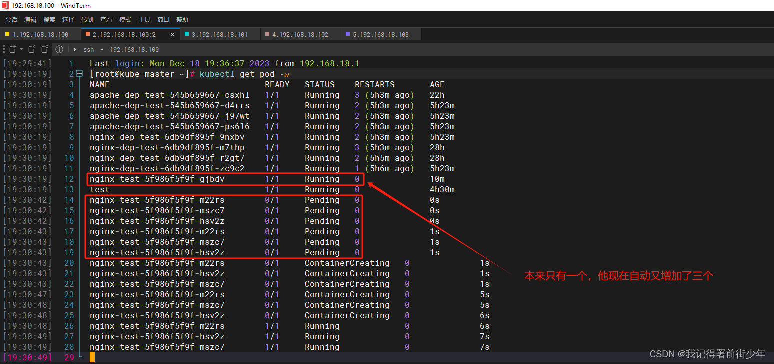 然后我们给master开一个窗口看他的结果,他会给我们再增加三个nginx副本。