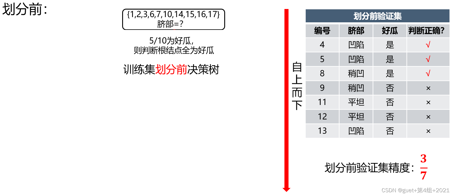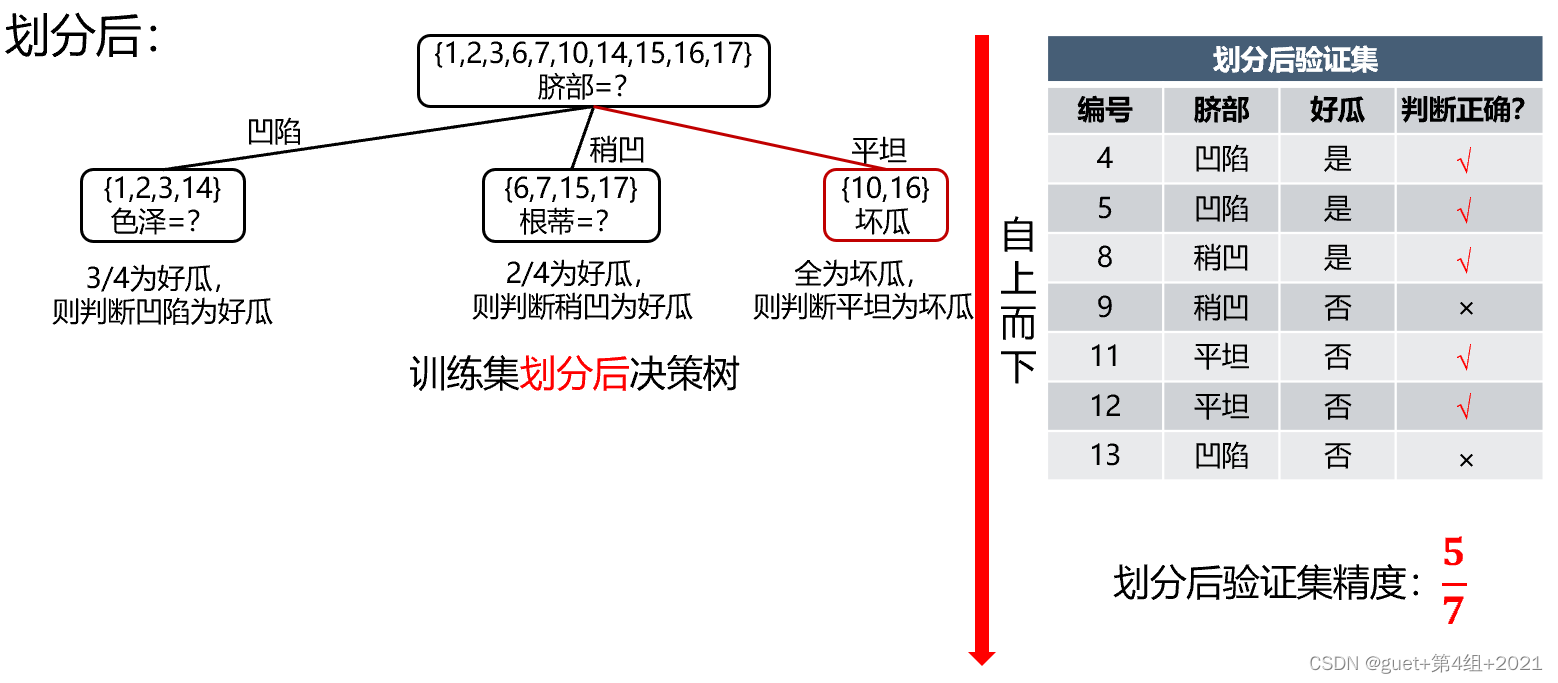 划分前验证集精度:3/7 > 划分后验证集精度:5/7