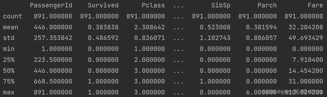 2、了解数据表的统计情况:总数、平均值、标准差、最小值、最大值等。