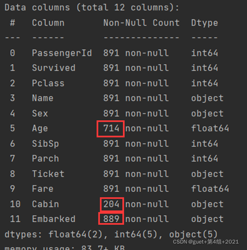 1、Age、Embarked和 Cabin 这三个字段的数据有所缺失。