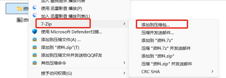 1、安装7-Zip后,选中文件或文件夹 → 右键 → 选择【7-Zip】→【添加到压缩文件】。