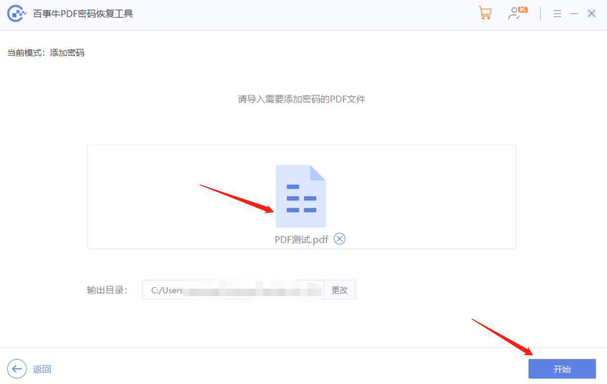 2、导入需要添加密码的PDF文件,点击“开始”就会弹出对话框,然后设置密码即可。