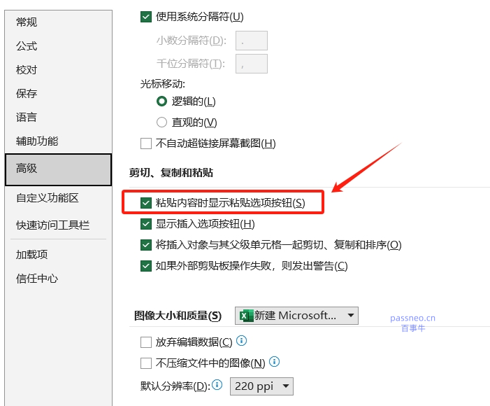 打开Excel文件后,进入【文件】→【选项】→【高级】,在“剪切、复制和粘贴”区域取消选中“显示粘贴选项按钮”选项。