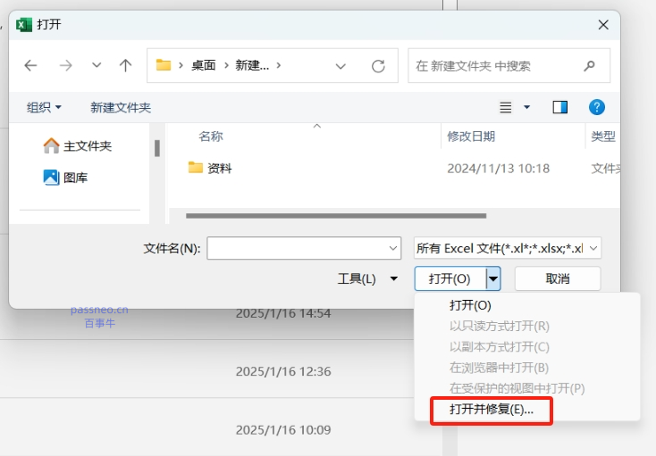 在打开Excel时,选择【文件】→【打开】,选择要修复的文件,点击箭头旁的下拉菜单,选择【打开并修复】。