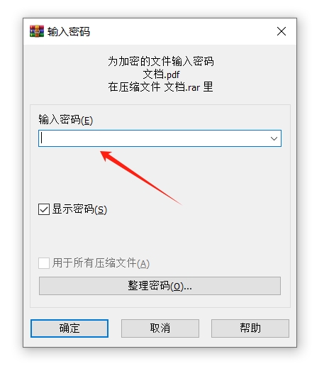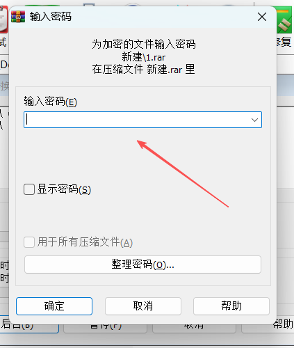 3、弹出密码对话框后,输入原本设置的密码,点击【确定】。随后,原本的压缩包就会解压,再自动生成没有密码的压缩包。