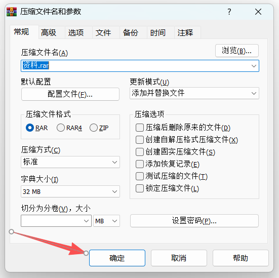 3、在“压缩文件名和参数”窗口中,不要设置密码,直接点击“确定”。这样生成的新压缩包就是一个无密码的文件。