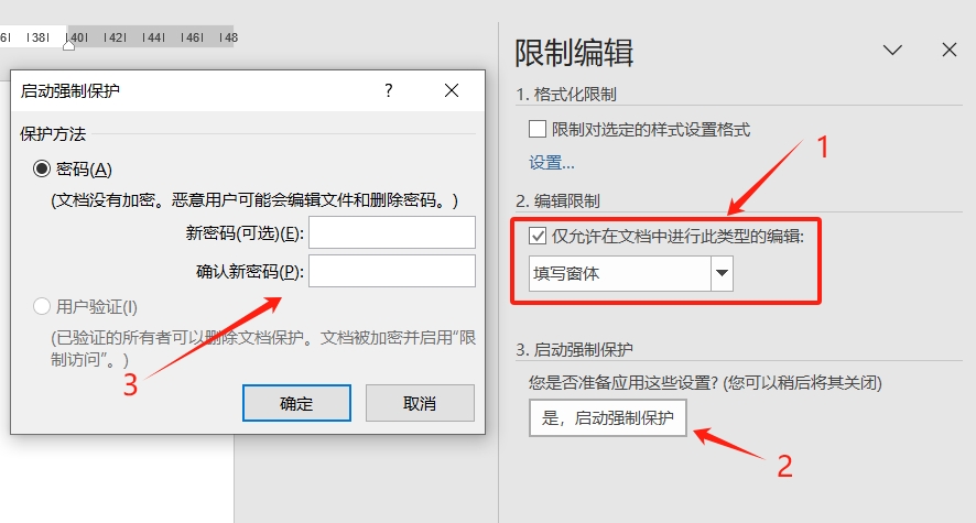 3、点击【是,启动强制保护】,弹出对话框后,设置一个密码,然后保存文档;