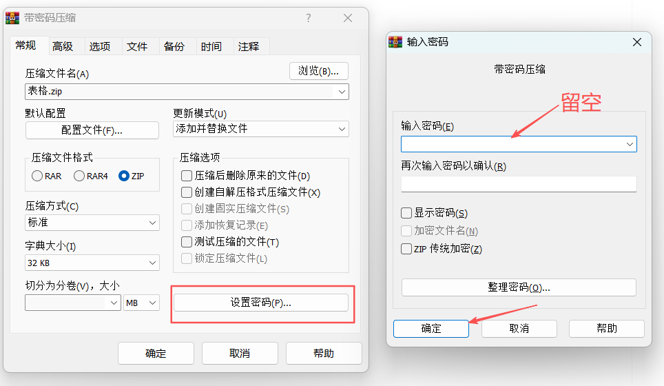 首先,使用WinRaR压缩文件,弹出对话框后,点击【设置密码】,弹出密码对话框后,让密码栏留空,再点击“确定”压缩即可。