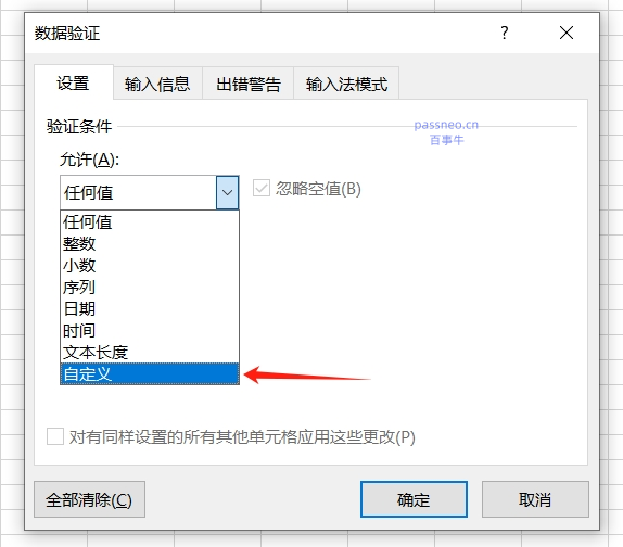 1、选中目标单元格,打开 “数据验证”,在“允许”中选择“自定义”。