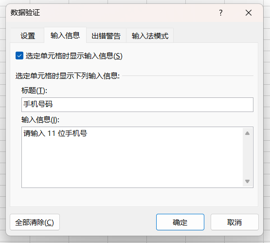3、补充技巧:在 “输入信息” 选项卡设置提示文字(如 “请输入 11 位手机号”),填写者选中单元格时会自动显示,更贴心。