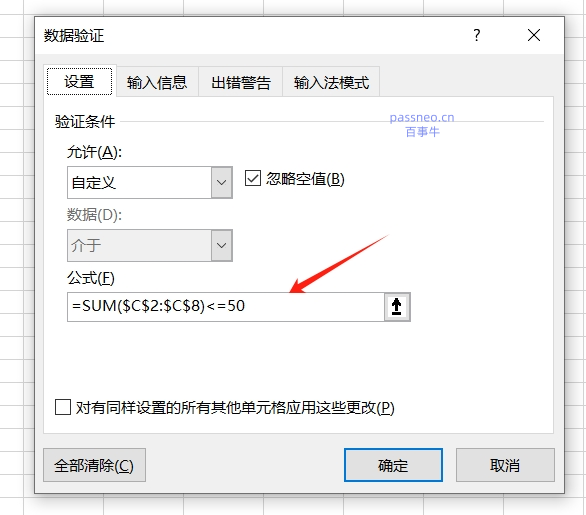 2、在“公式”中输入逻辑条件。比如想限制选中的单元格之和需要小于等于50,可以输入公式:=sum($C$2:$C$8)<=50,这里“$C$2:$C$8”是单元格位置。