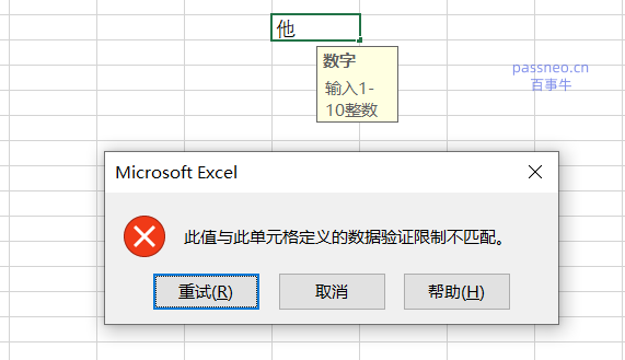 4、设置完成后,尝试输入其文字,会弹出错误提示,无法录入,确保输入数据合规。
