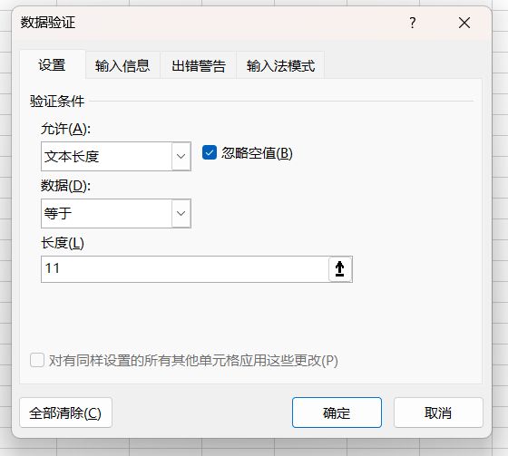 2、选择“设置”选项卡,“允许” 下拉选择 “文本长度”,“数据” 选择 “等于”,输入 “11”,确保手机号为 11 位。