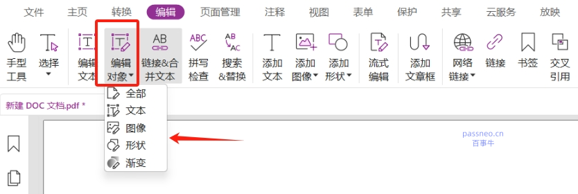 1、通过PDF编辑器打开 PDF 文件,找到工具栏中的【编辑对象】,选择你要编辑的内容,比如“文本”、“图像”等。