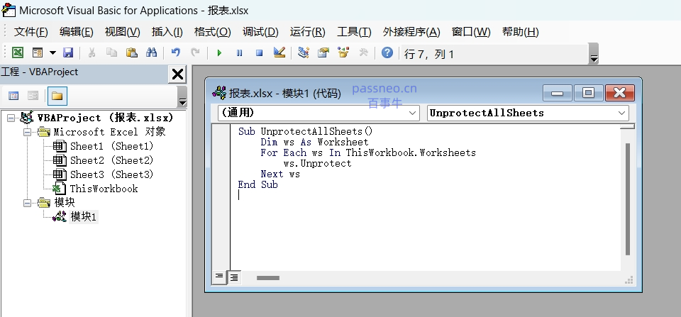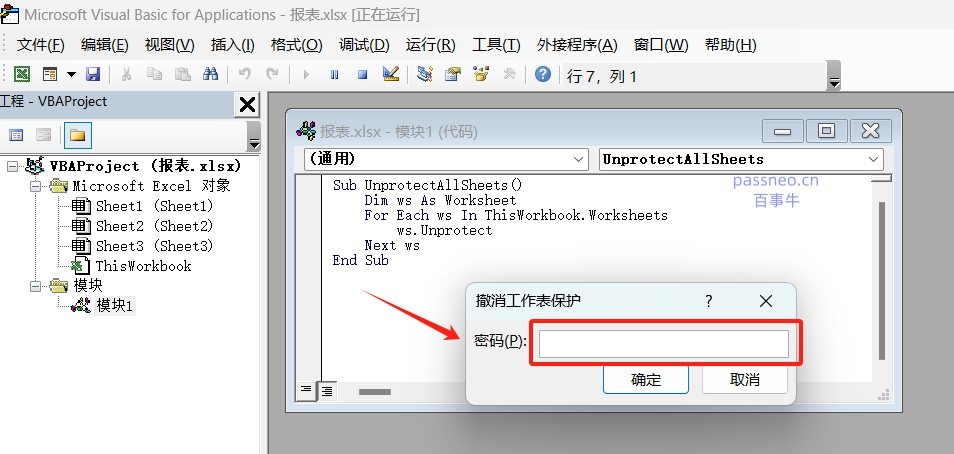 方法二:在VBA编辑器中批量解除“工作表保护”