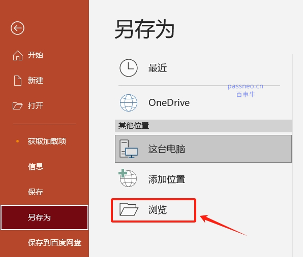 1、打开PPT文件,点击菜单选项卡【文件】,再依次点击【另存为】-【浏览】。