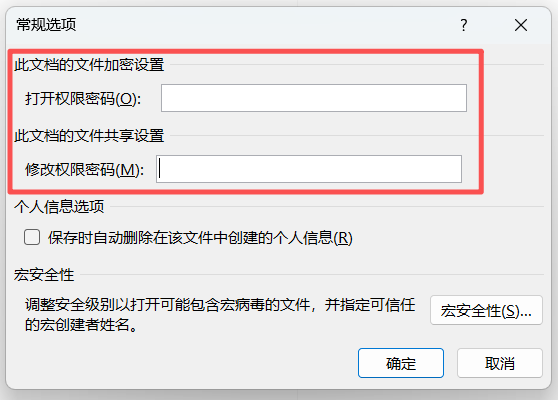 打开密码:直接限制别人打开你的文件。设置后,没有密码连文件都打不开,安全性最高。