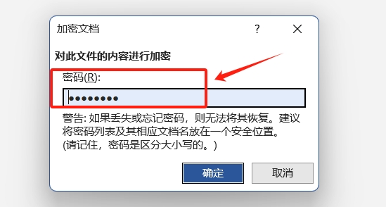 2、弹出对话框后,输入密码 → 确认 → 保存文档。