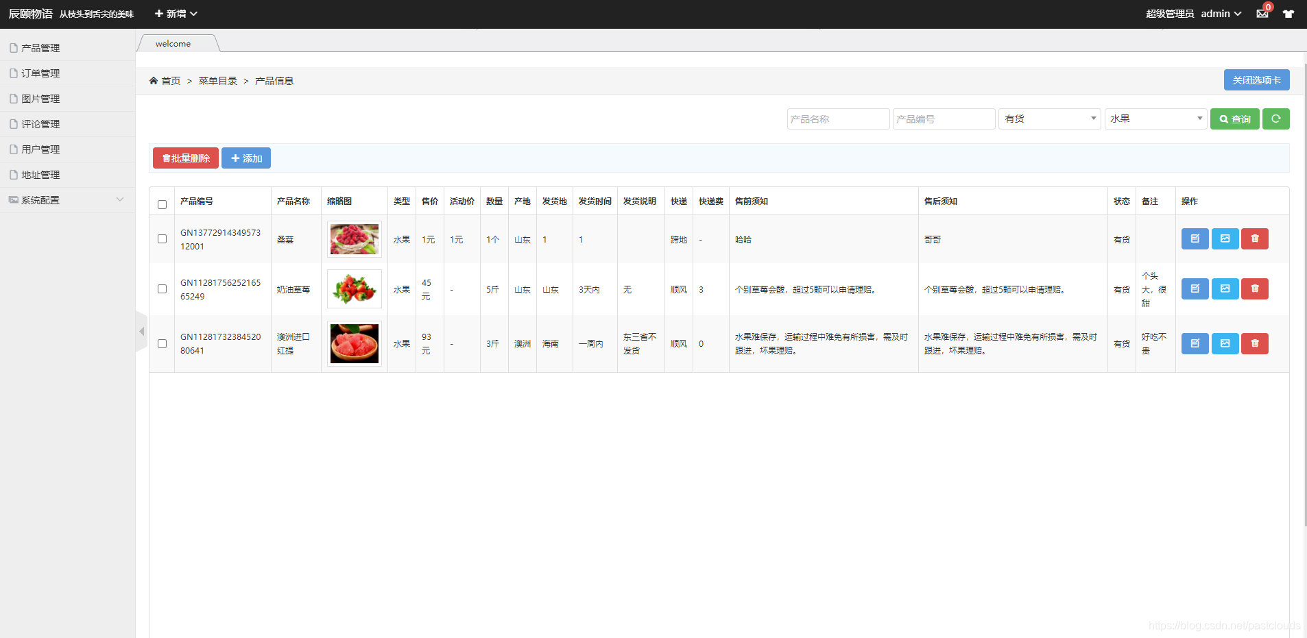本系统功能包括: 水果商城系统前台展示,分类后买,下单,支付,发货, 地址等等,后台商品上传,用户管理,订单管理,地址管理等等。