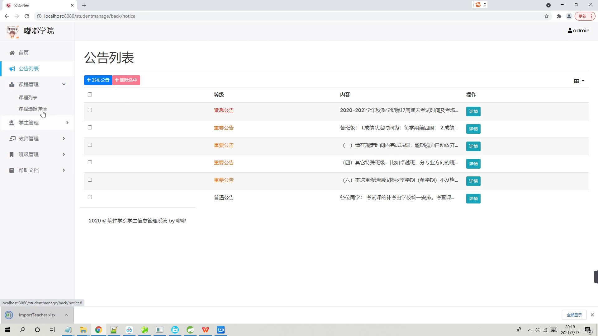 三角色管理: 学生,教师,管理员,在线选课,成绩录入,学生管理,选课管理,教室管理等等。学生管理可以查看所有学生并操作、添加学生;查看学生选报课程详情等等。教师管理可以查看所有教师并操作、添加教师等等。班级管理可以查看所有班级信息并操作、添加班级等等。