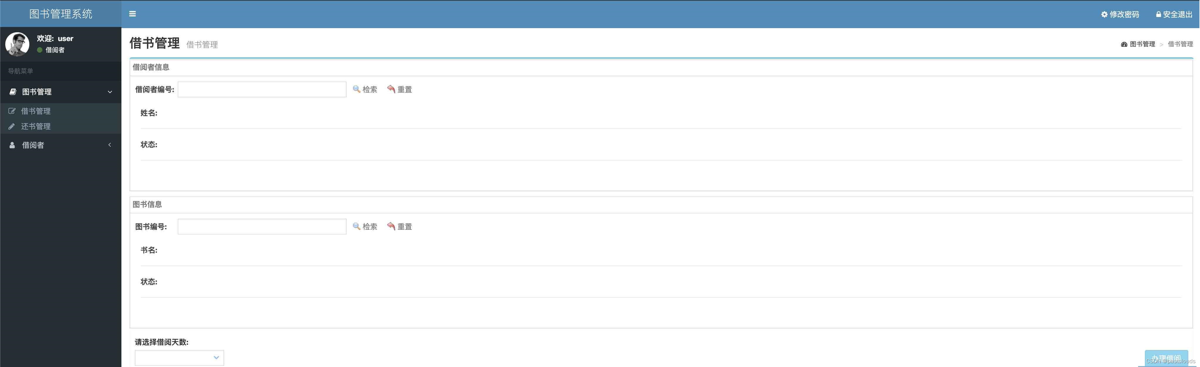 借阅管理,图书检索,查看借还记录,查看图书详情,还书管理,登录页面等功能。