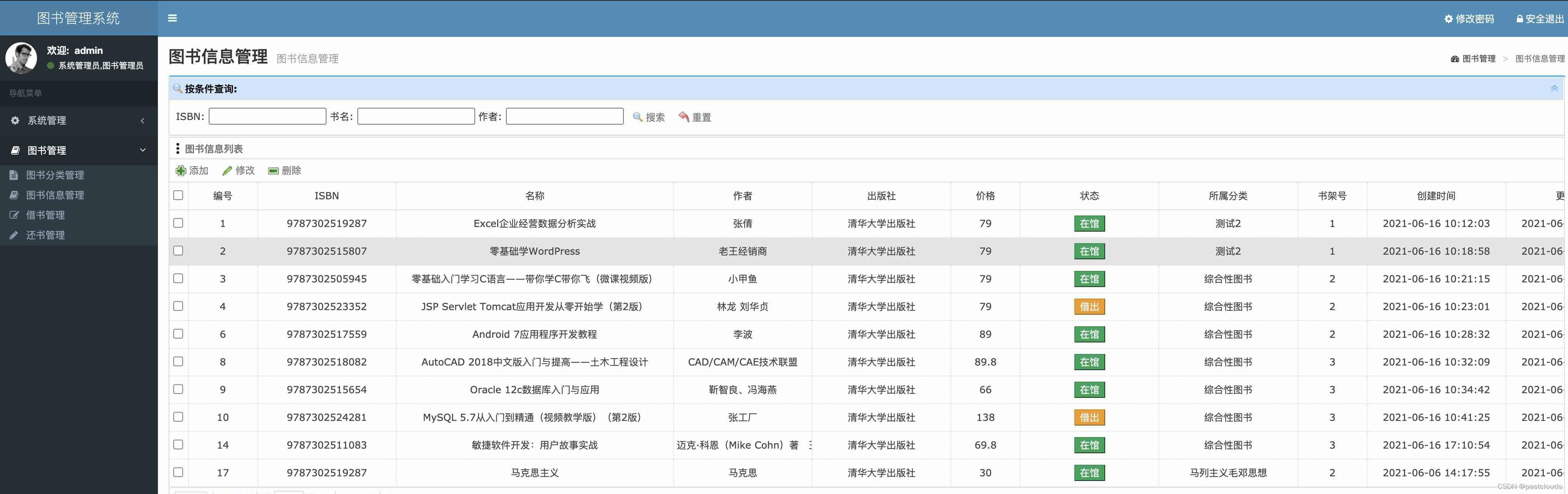 借书管理,图书信息管理,图书分类管理,用户管理,角色管理,还书管理,登录页面等功能。