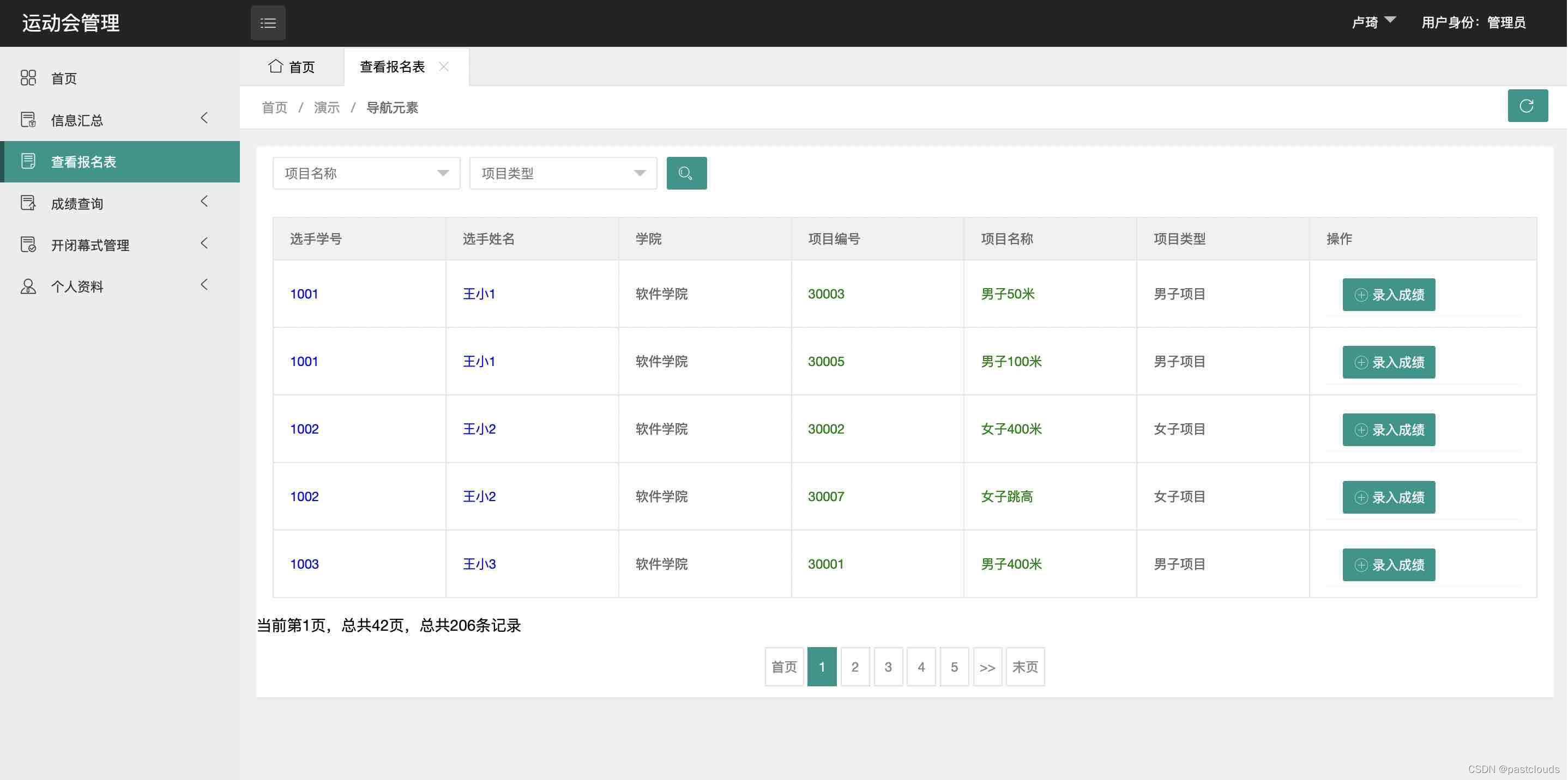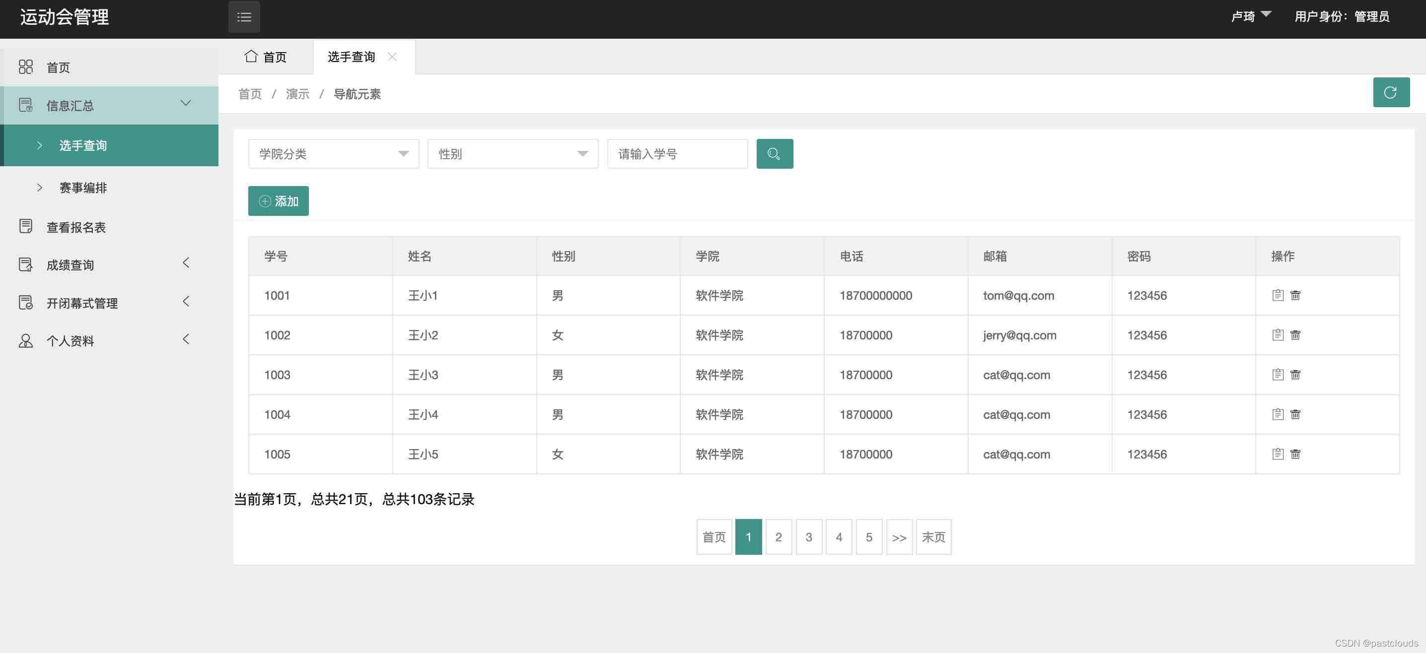 功能:登录、查看个人资料、修改密码、选手管理、赛事管理、报名管理、成绩管理、开幕式管理、闭幕式管理