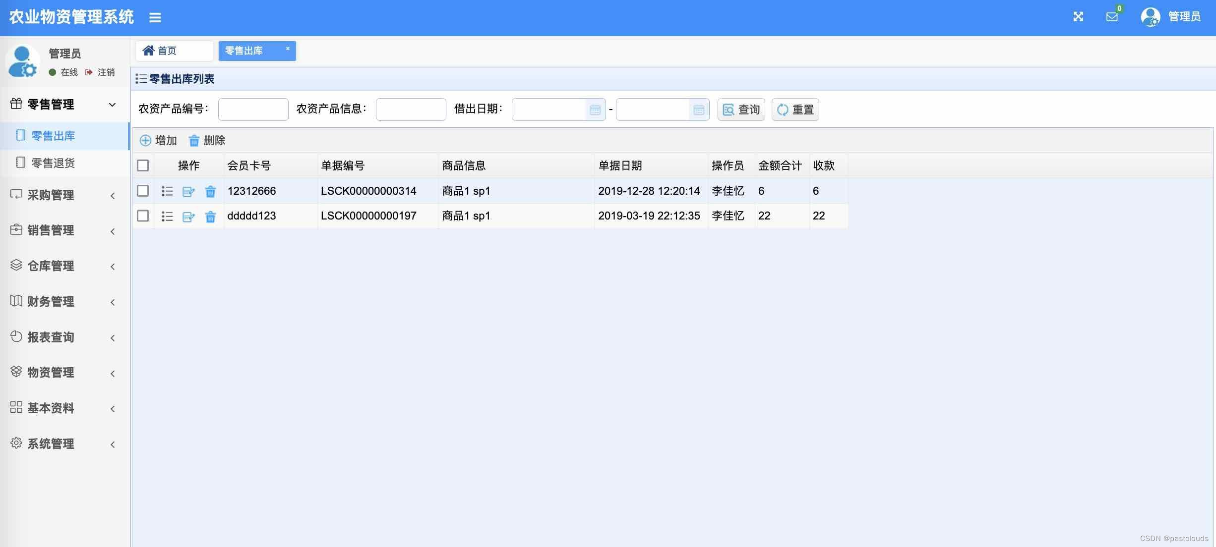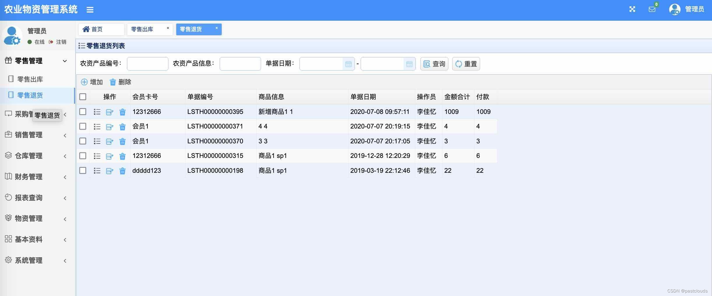 主要功能包含:登录、注册、修改密码、零售出库、零售退货、采购订单管理、采购入库管理、采购退货管理、销售管理、财务管理、报表管理、物资管理、基本资料管理。