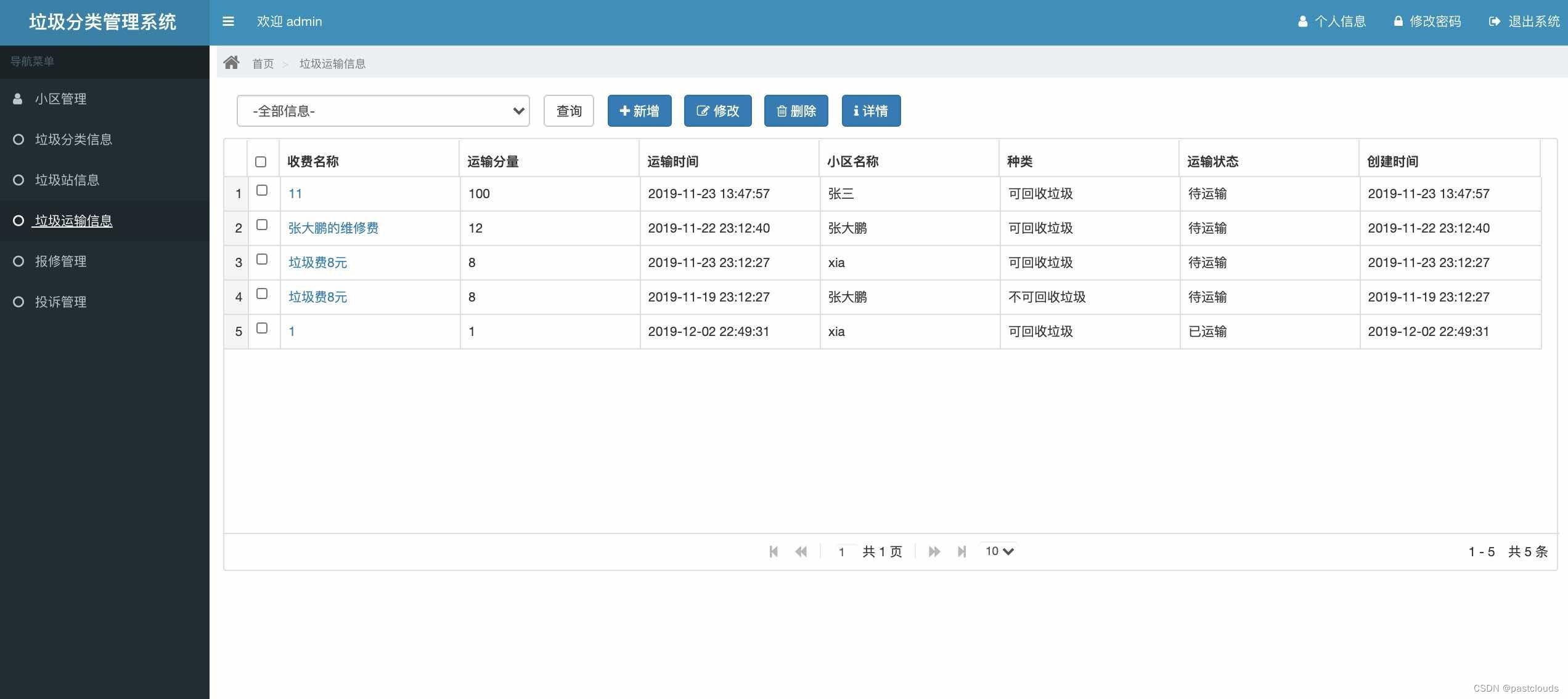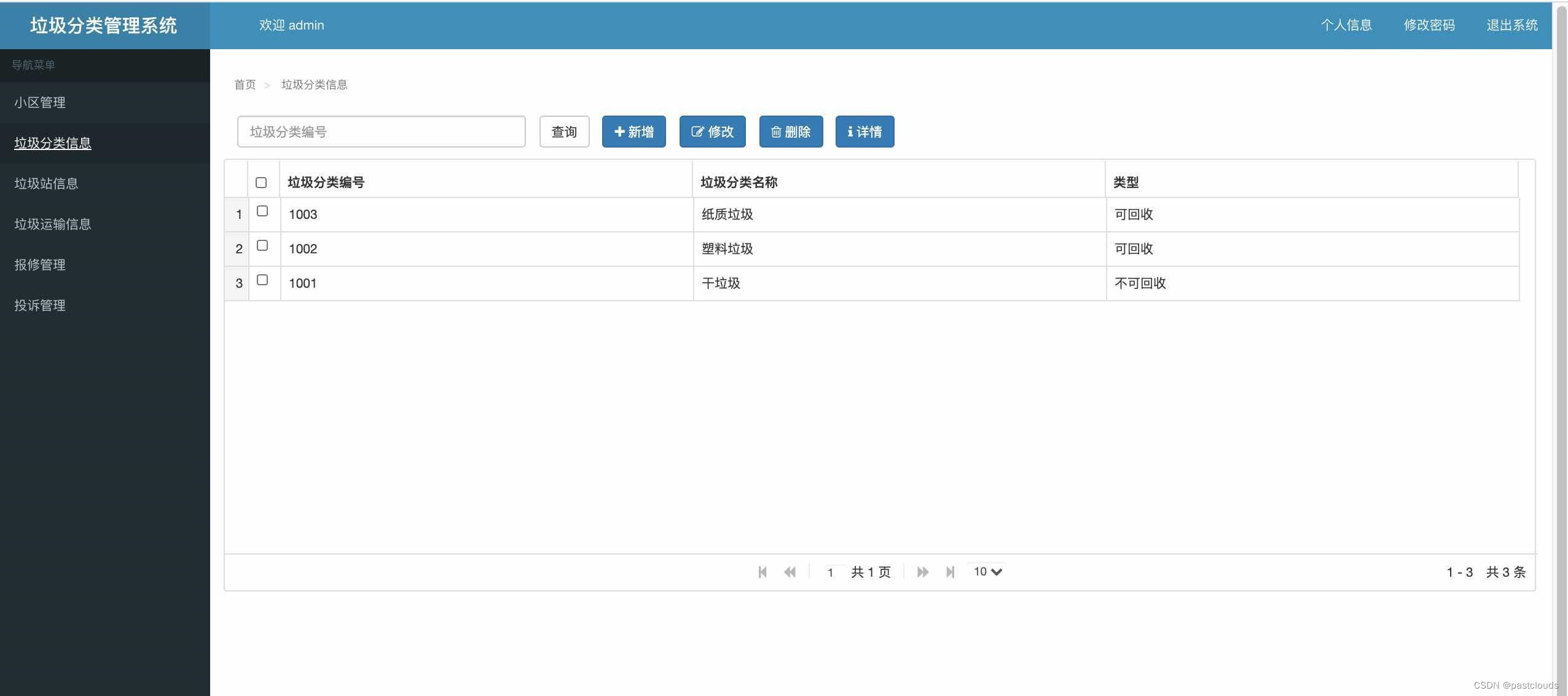 这是一个采用Spring、SpringMVC、MyBatis技术栈开发的垃圾分类管理系统,具备小区管理、垃圾分类、垃圾站、运输等信息管理功能。系统设计简洁易用,支持角色权限管理。用户和管理员有不同的操作权限,如用户可以查看信息,管理员则能进行增删改查等维护操作。