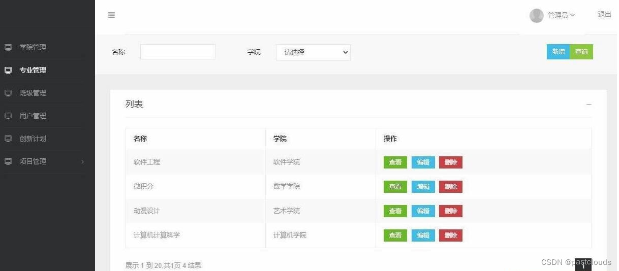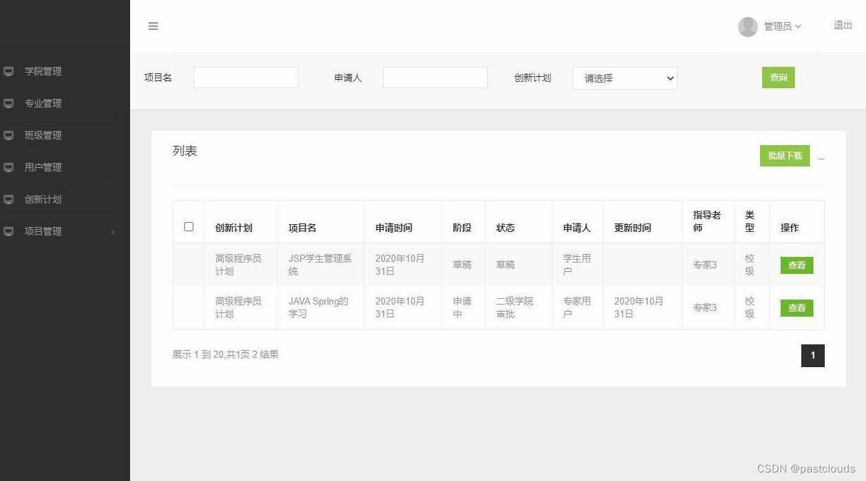 管理员登录,学院管理,专业管理,班级管理,用户管理,创新计划查看,查看项目申请,项目申请审核等功能。