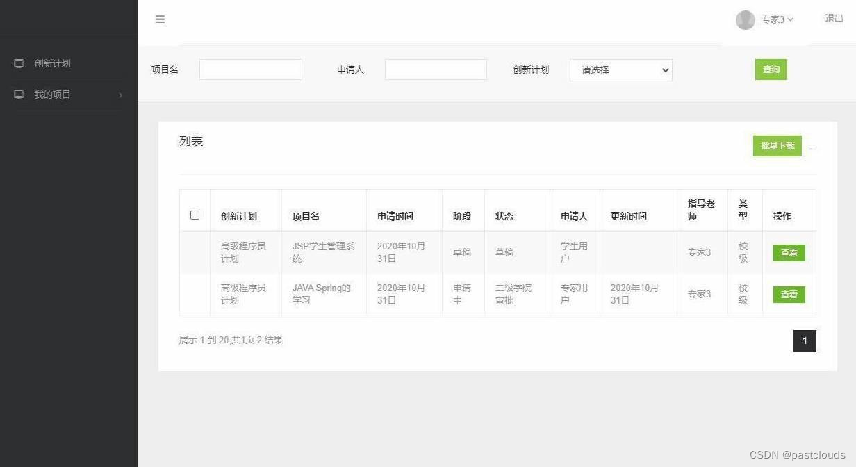 专家登录,查看创新计划,申请项目,学生项目列表,管理预算记录等功能。