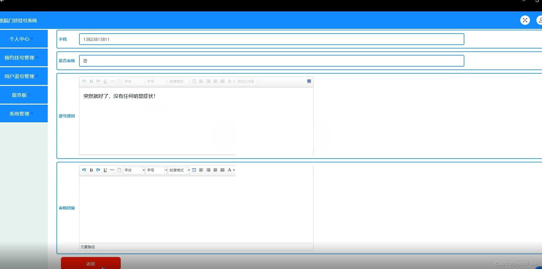 医生登录进入系统可以对主页、个人中心、预约挂号管理、用户退号管理、留言板、系统管理等功能