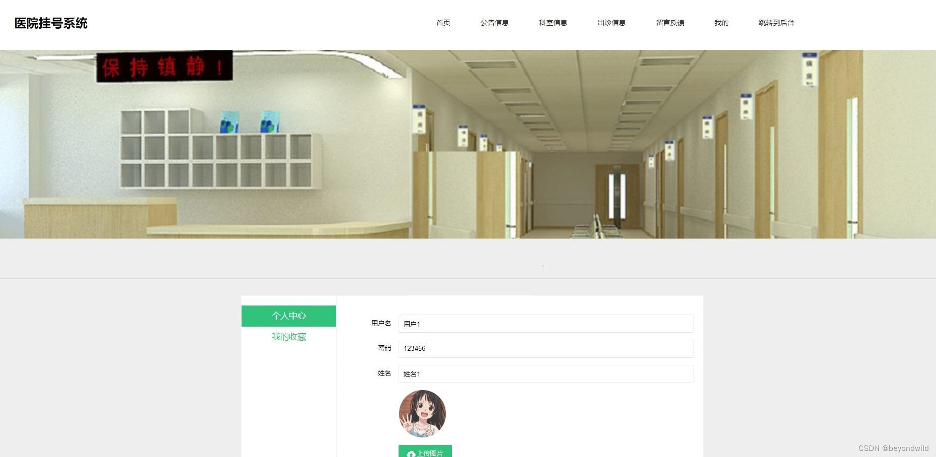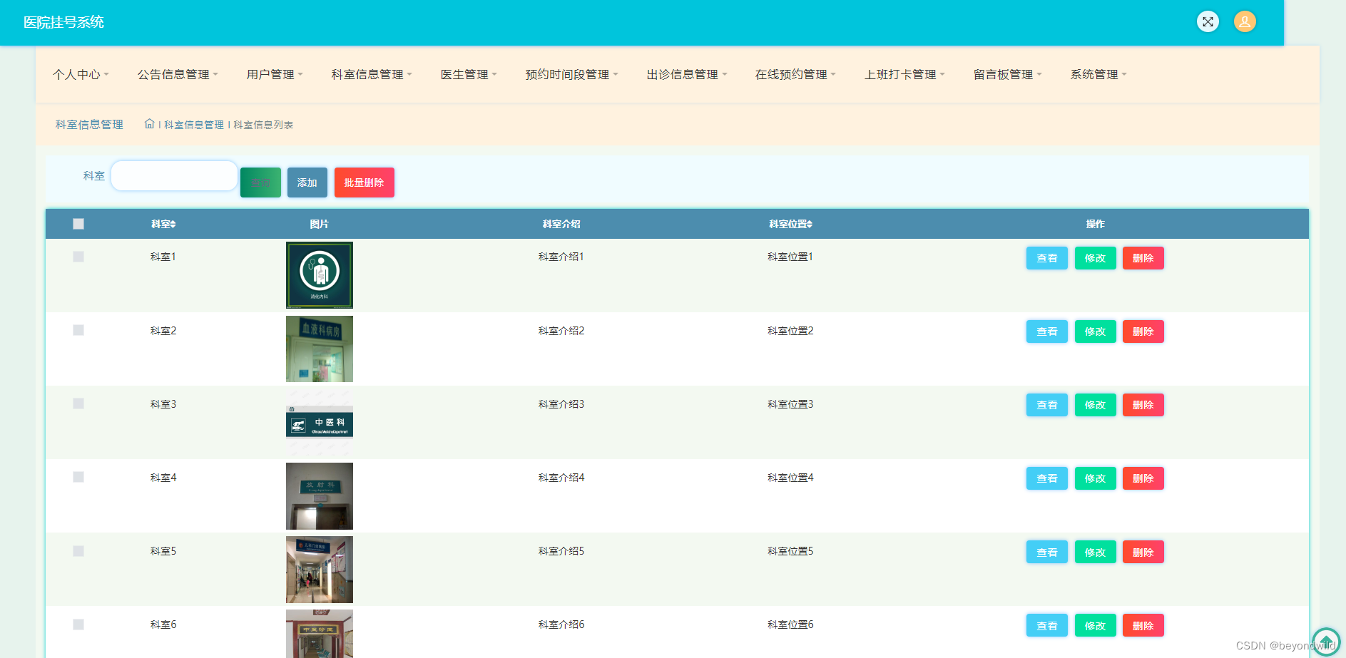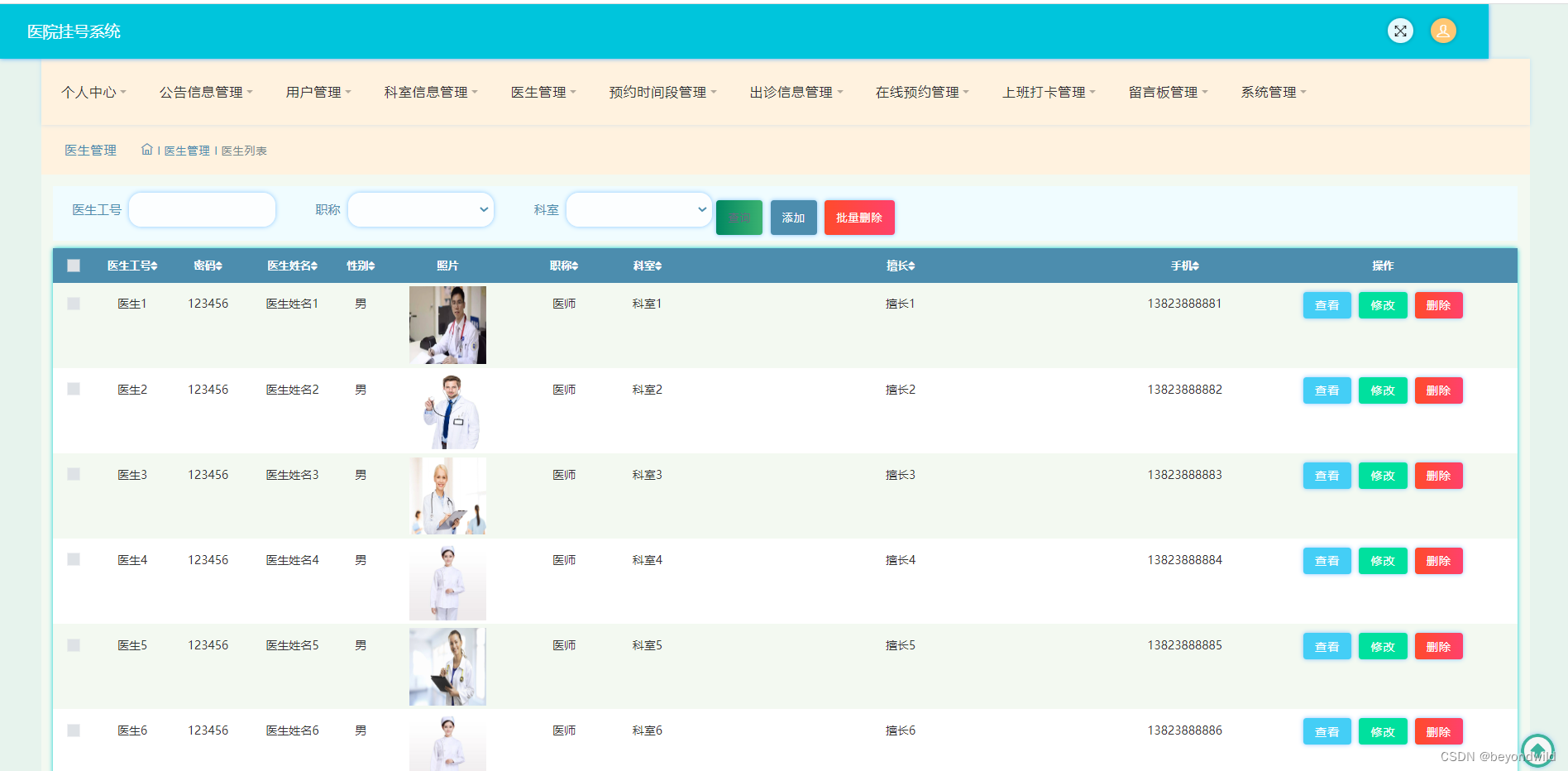 管理员:管理员、个人中心、公告信息管理、用户管理、、室信息管理、医生管理、预约时间段管理、出诊信息管理、在线预约管理、上班打卡管理、留言板管理、系统管理。