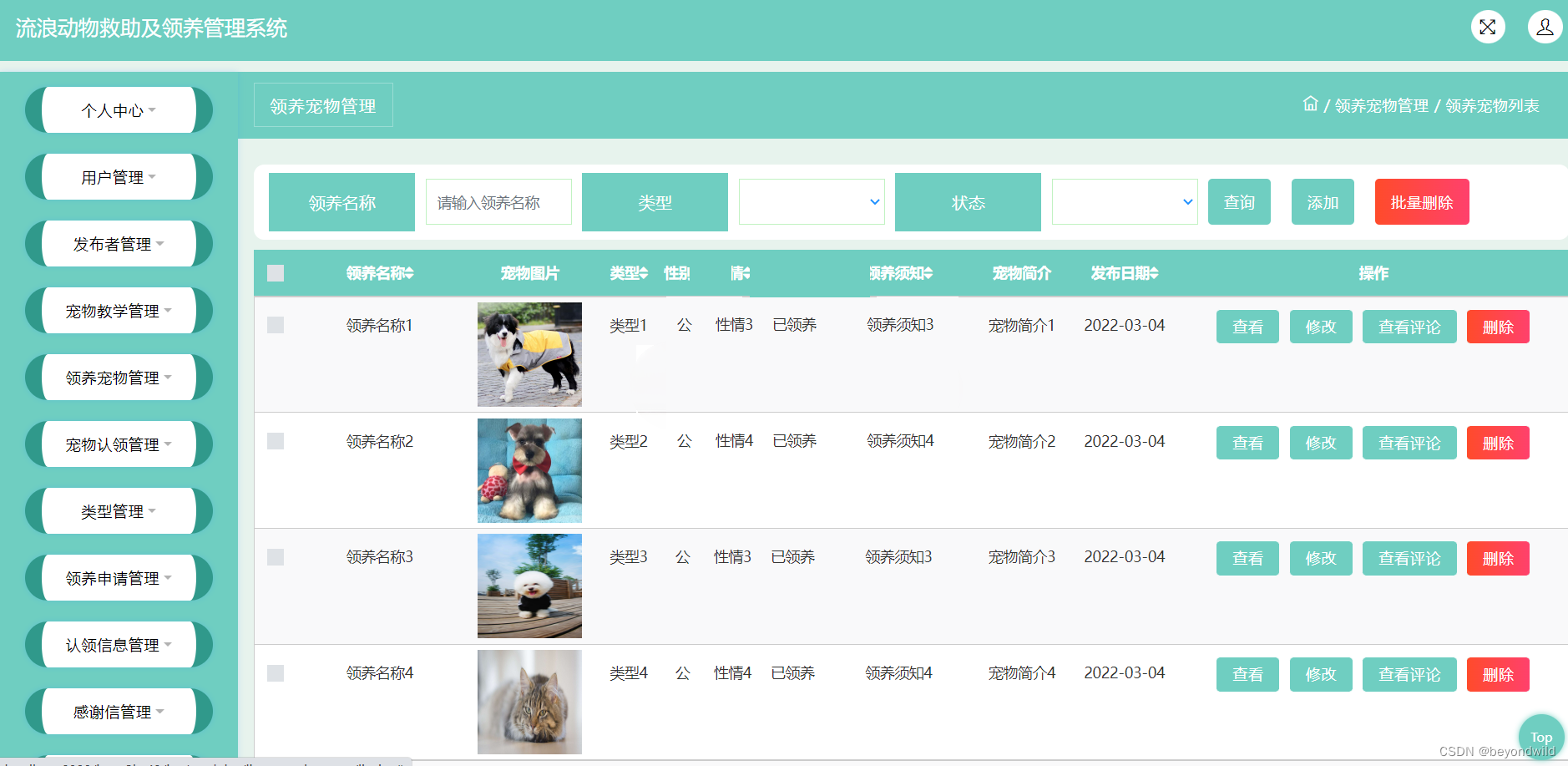 (5)宠物领养页面,查看管理员发布的宠物领养信息列表,点击查看宠物详情,提交领养申请,等待管理员审核,通过后方可领养。