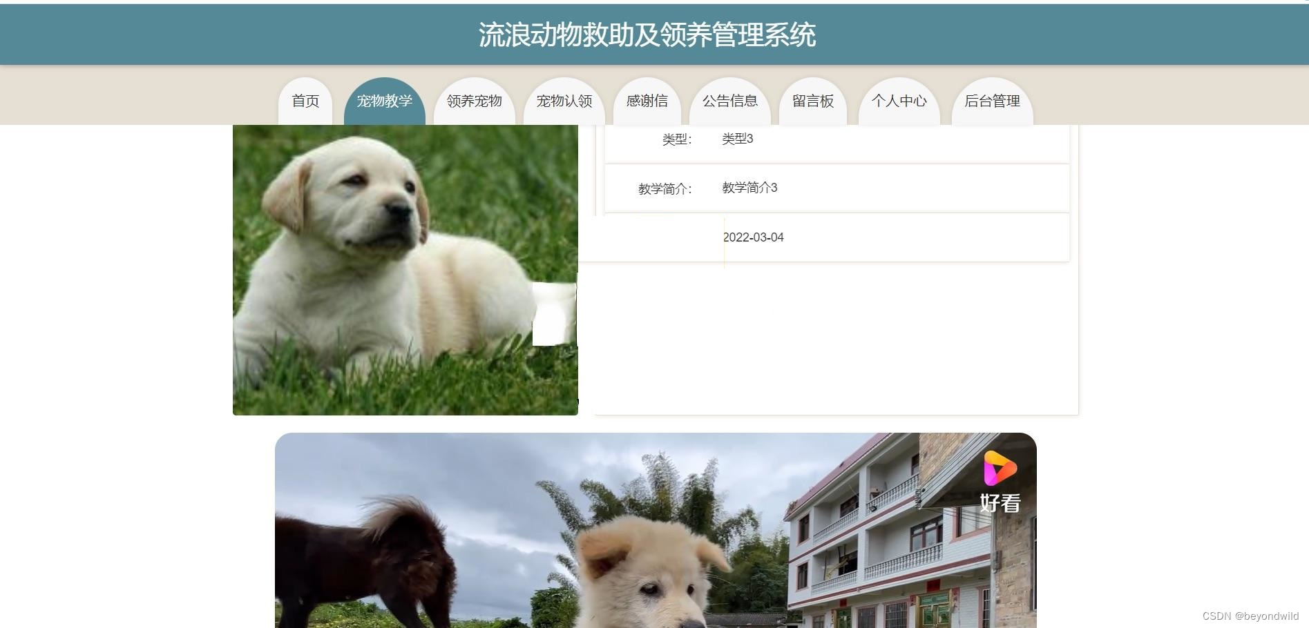 (3)宠物教学页面,点击进入宠物教学页面,观看宠物饲养教学视频,视频根据动物类别分类,支持模糊查询搜索视频,用户可以点赞留言。