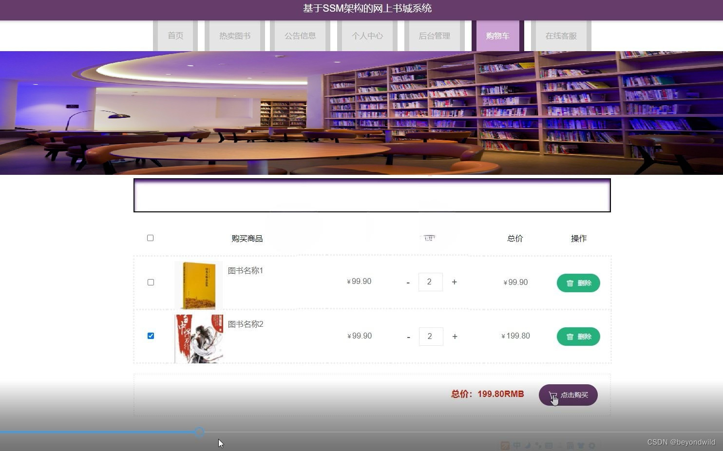 用户登陆后,主要模块包括首页、热卖图书、公告信息、个人中心、后台管理、购物车、在线客服等功能